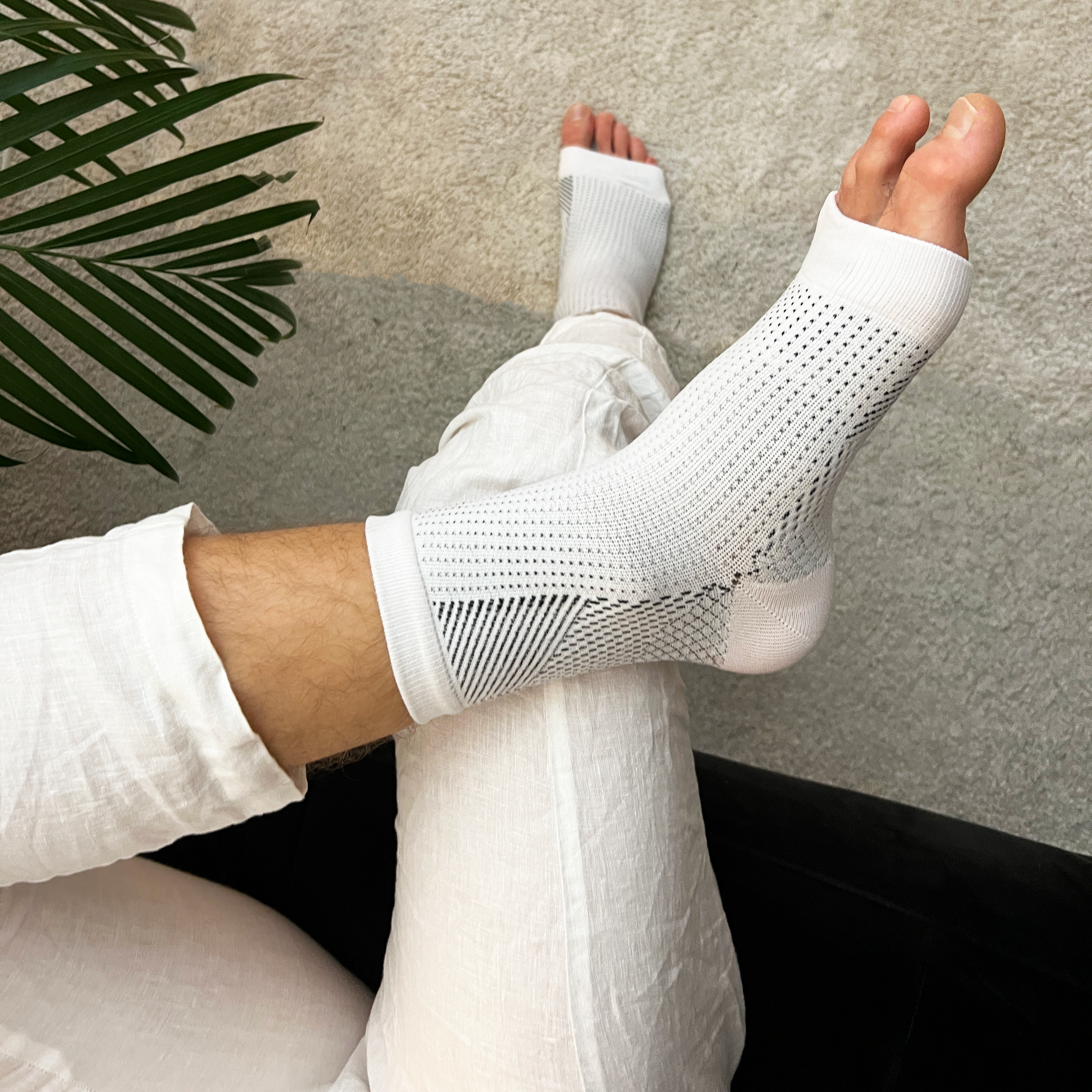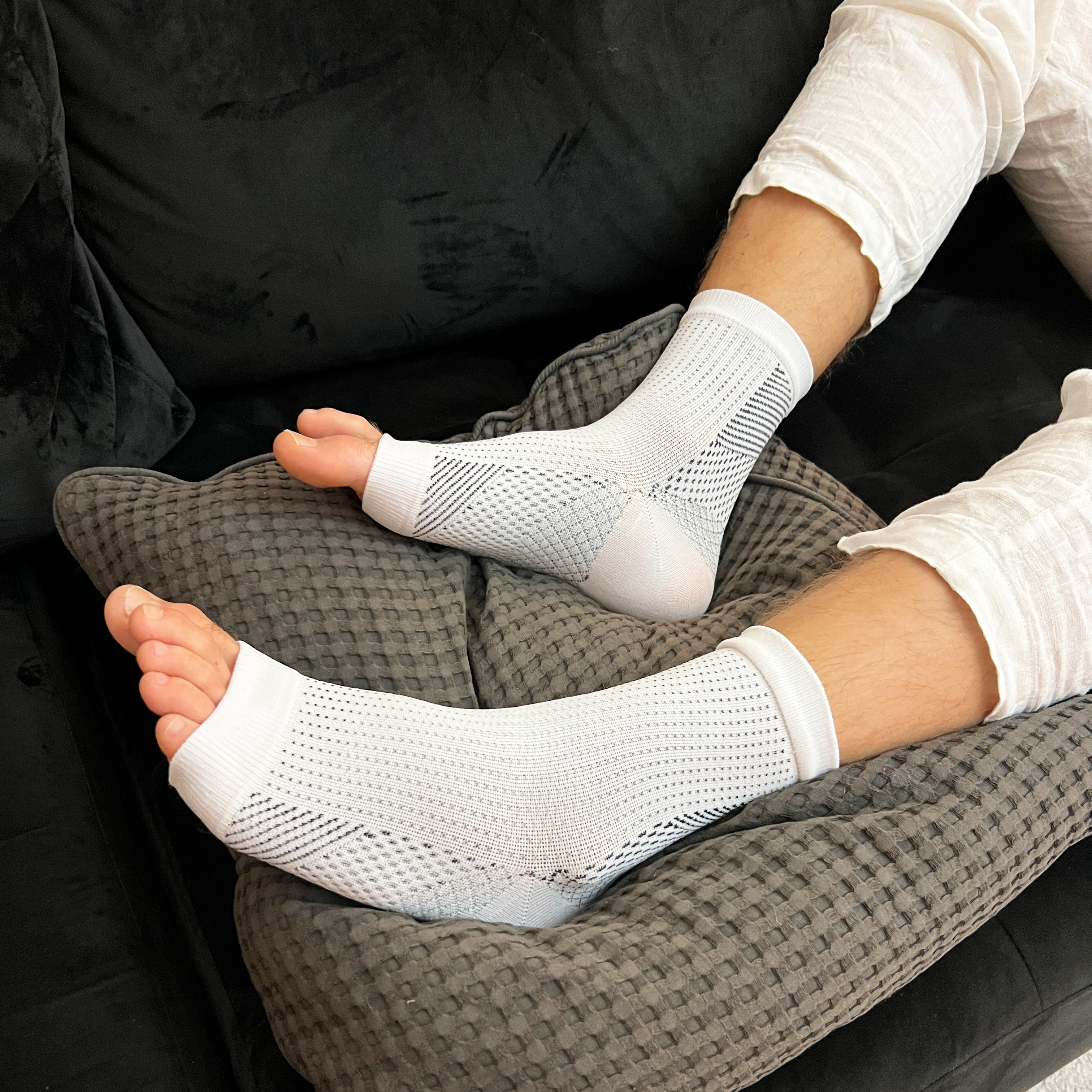 Reliefr hielspoorsokken werken door graduele compressie toe te passen, met de hoogste druk bij de enkels, wat de bloedcirculatie verbetert en zwelling vermindert.